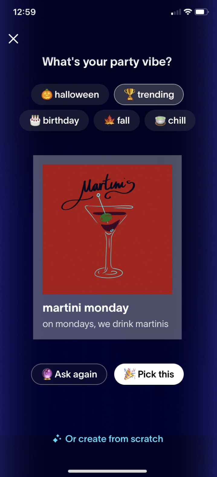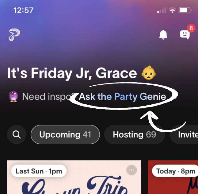 Party Genie is a feature in the Partiful app that lets users browse event templates. The goal is to inspire others to host unique, funny, and interesting parties. So many users have told us about the amazing events they host like "water tasting party" or "fake art auction" and we'd love to see more! If you think your party concept is a hit, share the wealth!
