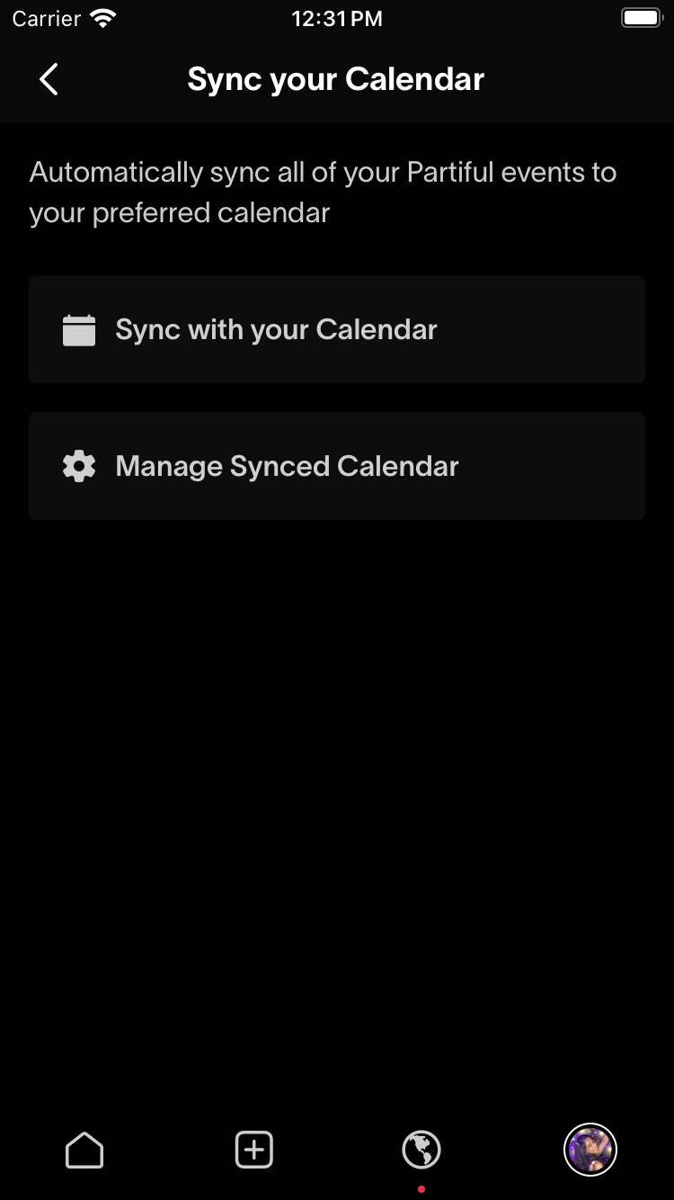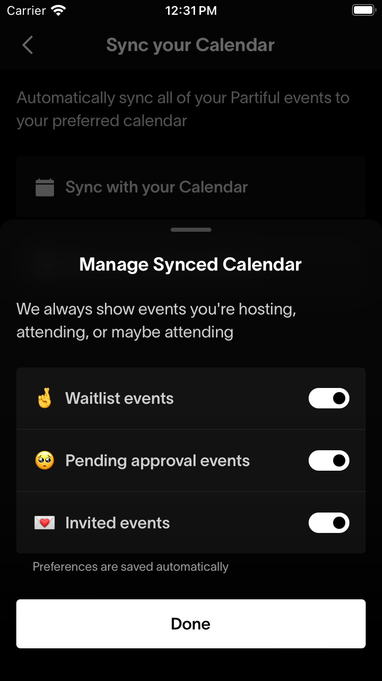 In the Partiful app, open your profile and click on Settings (gear icon). Then click on "Calendar sync preferences" and "Manage synced calendar" to choose which events you would like to sync.