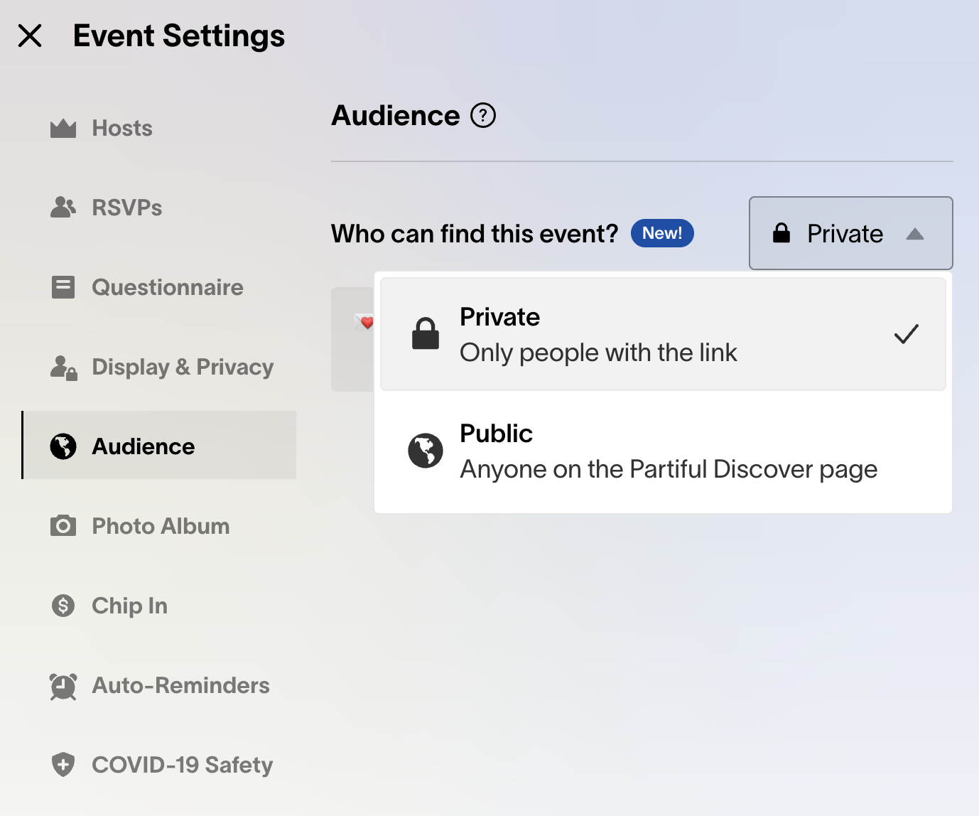 How do I mark an event as public? Open your Event Settings and click on the Audience tab. Then select "Public" from the drop-down menu.