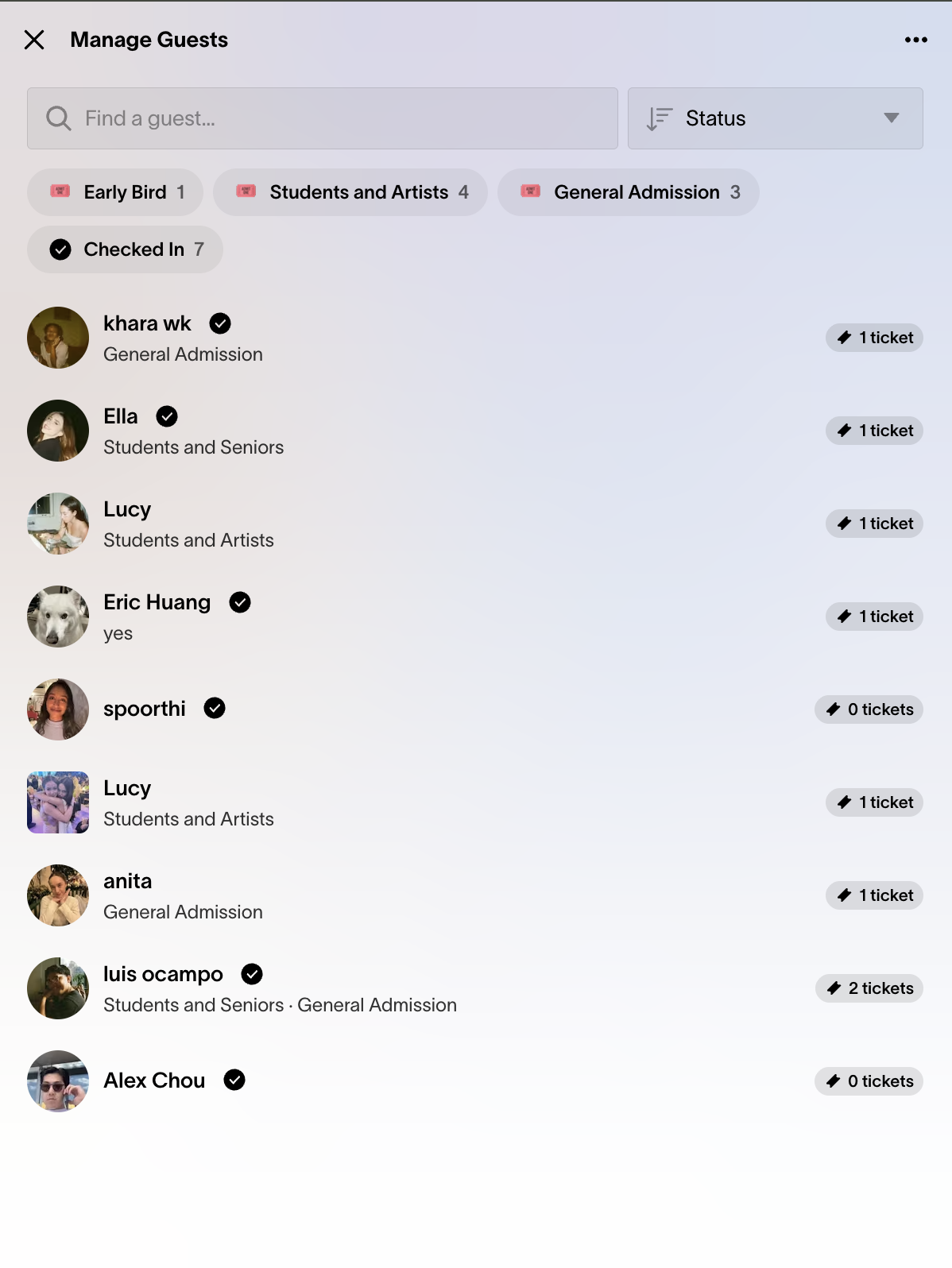 Go to your event page → click the Guest List. You'll see all ticket buyers, their ticket type, and check-in status. You can search and manage guests from here.