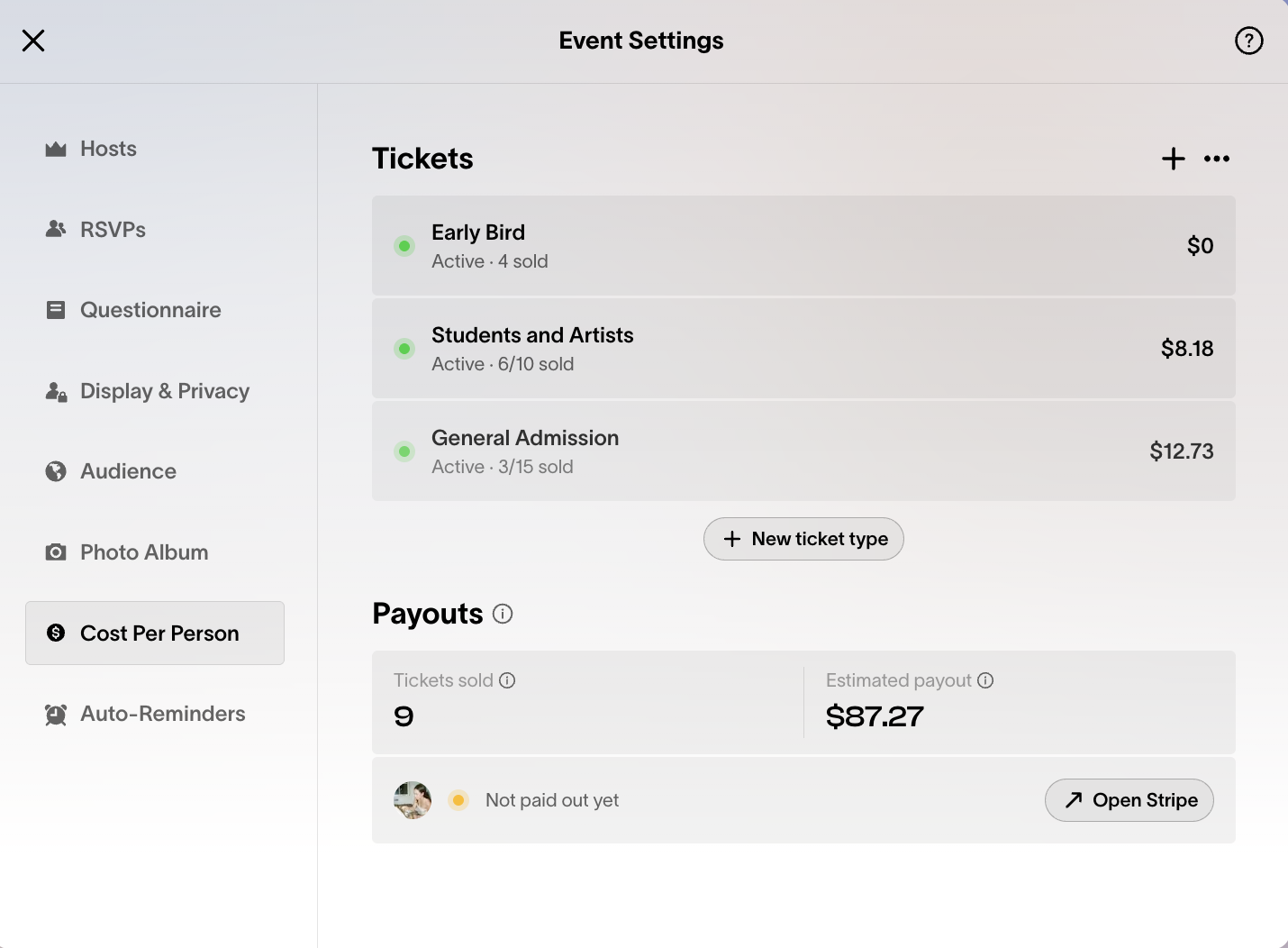 Track payout status in your event dashboard under Payouts. In Payouts, you’ll see number of Tickets sold, Estimated payout (earnings after Partiful fees), and payout status.